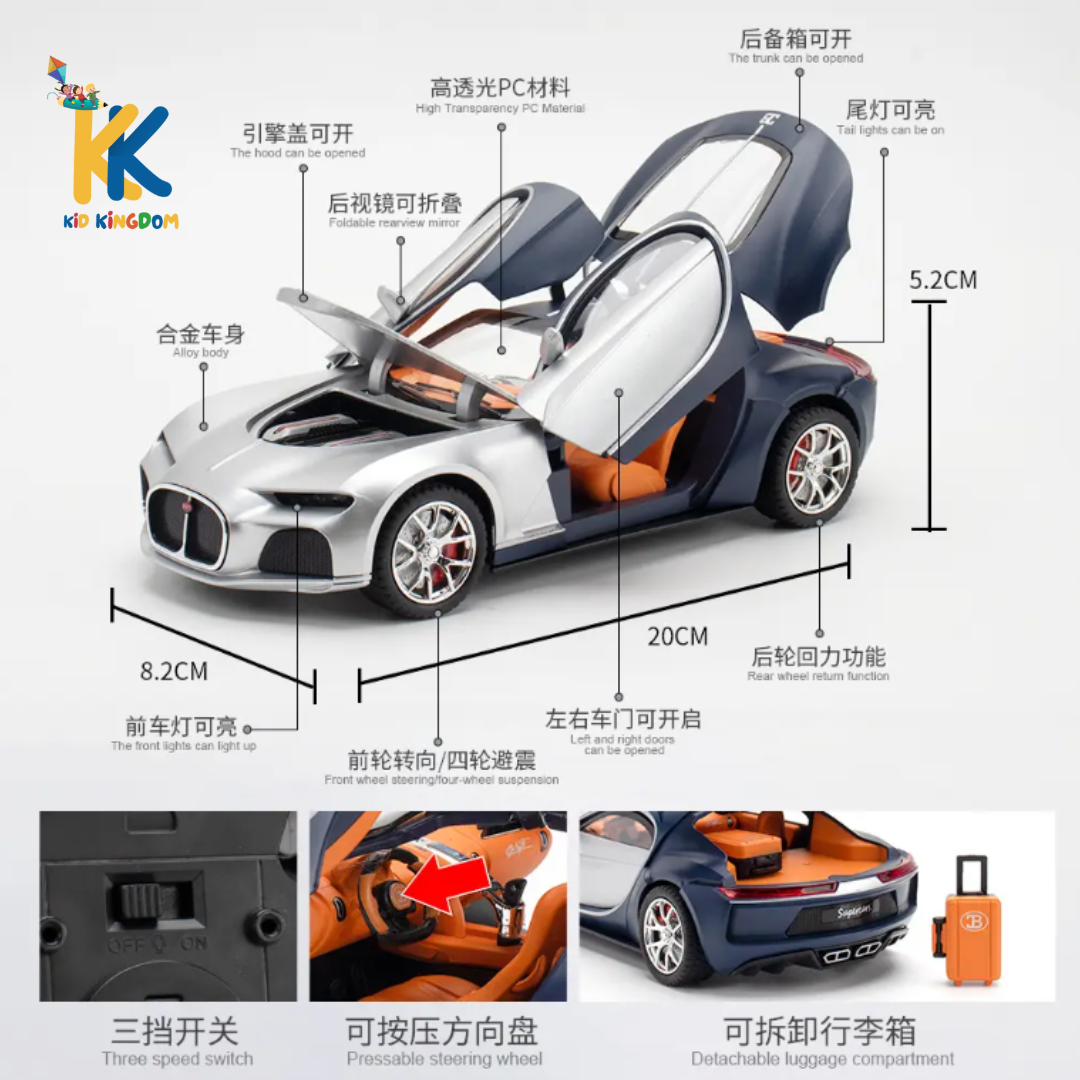Experience the elegance of a luxury supercar in miniature form with our Bugatti Atlantic Metal Die-Cast Car. Designed with premium alloy body, working lights, opening doors, hood & trunk, and realistic detailing, this toy car is a must-have for kids, collectors, and car enthusiasts. Comes in individual premium packing – making it a perfect gift!